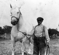 Image taken in 1920, of Andrew Bowman holding a horse. The horse is white and wearing reins. Andrew Bowman is wearing a, IHS2263
