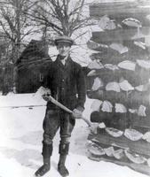 Photo of John Davies stacking cordwood at Strathallan. The wood was cut to burn for specifically for heating., IHS1843