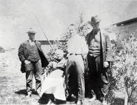 Outdoor photo of members of the Irving and Luck family. Standing on the far left in a hat, coat, and waistcoat is George, IHS2378-C