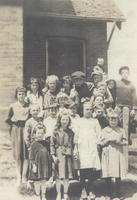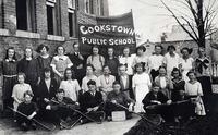 Group photo taken in 1920 of Cookstown Public School's students. They are posed beside the school building and are,