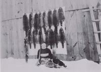 Photo of Bertram Wright seated in the snow and leaning against a wall on which a number of raccoon pelts have been, IHS3406