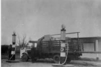 Photo of a flatbed truck after fueling at a service station. There are two tall gasoline pumps visible in front of the, IHS1852