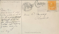 Scan of the back of a postcard sent to Isabella "Bell" Canning, a dressmaker in Churchill. The card was mailed in April