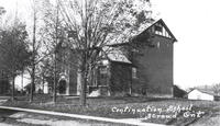 Photo of the Stroud school building, built in 1923. The image shows a multi-storied brick building with a gabled roof, IHS3383-8