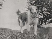 Johnny, a long-haired dog with two-toned fur belonging to the Houston family, is trotting toward the camera. Slight, IHS3583