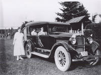 Image of a car parked on grass, taken in 1926. Mrs. Margaret Wisker stands next to the car, wearing a dress and her hair, IHS3628