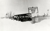 Photo of the Stonecroft Motor Camp in winter with an unidentified group of six people standing in front of it. There is, IHS1853