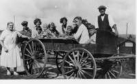 Photo of the owners of Stonecroft Motor Camp, Mr. and Mrs. Emily and John Yeates, riding in a Democrat wagon at the, IHS1854