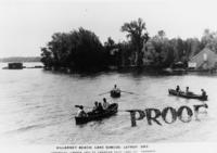 Postcard photo depicting three rowboats with four, one, and three passengers respectively at Killarney Beach, Lake, IHS2143