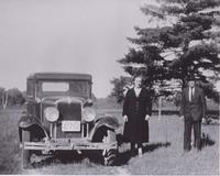 Image taken in 1933, of Percy and Bertha Thompson standing with their car. They are standing outside of their car, while, IHS3695