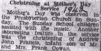 Announcement of Baptism of Andrew John Francis Cowan, son of Frank and Blanche (Andrews) Cowan, IHS3112