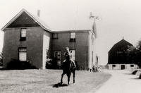 Irving Nelson on horse back with the Nelson farmhouse and barn in the background., IHS2276