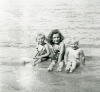 Photo of three young girls in bathing suits sitting in the shallow water near the shore of the beach at the foot of the, IHS 4355