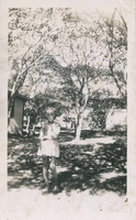 Photo of a young girl identified as Flo standing under some trees at Alcona Beach in 1944.