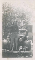 Photo of a young woman identified as Eve standing on the bumper of a car at Innisfil Park in 1944.