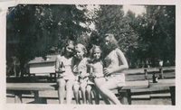 Photo of four girls sitting on a park bench drinking pop from glass bottles in Innisfil Park in 1944. They are