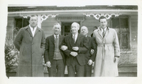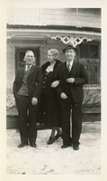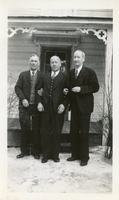 Photo of Jack Constable, George Constable, and Alexander Constable wearing dark suits and posing in front of the porch