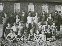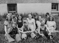 (note) Right to left: back row: Mrs. Morris (Joyce) teacher, Margaret Smith, Doris Browning, Catharine Paterson, Leonard, IHS694