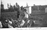 Photo of Robert James and Heather Gail, children of Albert and Betty Cheesman, feeding chickens behind Meadowbrook,