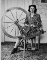 Jean Saunter at spinning wheel. She spun Angora wool from rabbits raised and knitted it into garments, IHS1663