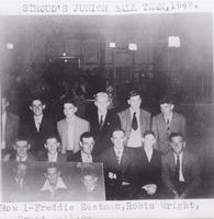 Group photo of the 1947 Stroud Junior Ball Team taken in a hall or community centre. The young men are in two rows with, IHS3382-86A