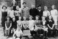 Photo of the Painswick School class of 1947-48, with Marion Webb as teacher. The photo was taken outside against a brick, IHS4080