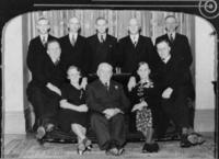 Group photo of the Innisfil Council in business attire during the Centennial year, 1950. Pictured from left to right -,