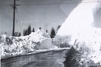 Photo showing a sidewalk curving between trees that is flooded. Most of the ground is still covered with chunks of snow, IHS3382-58C