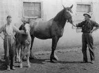 Photo of Parker Peacock and Fraser Sutherland standing beside a farm building with a large, fully grown horse as well as, IHS3382-65B