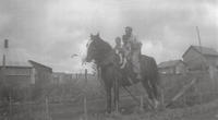 This is a picture of Bruce Wice, farmer, and his two young sons, Ross and Mervin scuffling the garden with horse, Laddie, IHS3874