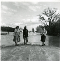 Photo of three women - Alice Baker, Lavina Poole, and Elsie Rivett - standing in a flooded roadway in Cookstown in 1954