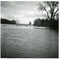The effects of Hurricane Hazel in October 1954 at the bottom of Concession 7. The photo shows the bridge washed away. , IHS4223