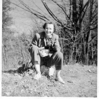 Photo of Frances "Fran" Westman (née Crooks) holding a pair of binoculars and seated on a stone wearing a patterned suit