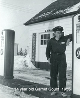 Photo of Garnet Kenneth Gould, son of Kenneth and Anne Gould, at age 14 standing beside a gasoline pump outside of