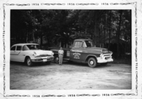 Photo of Ernest "Ernie" Harold Warnica as a boy standing next to his father's pickup truck. Painted on the side of the