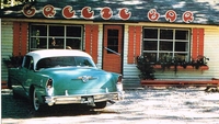 Photo of the entrance to the Breeze Bar restaurant in 1956. The photo shows an orange/red door and shutters below a