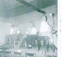 Three men playing instruments on stage at Stroud Community Hall. Gernet Gallaugher on fiddler, Jack Webster on Piano,, 4516