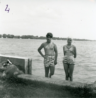 Wayne Murray, aged 15, son of Tom and Dorothy Murray and a friend, Patricia Bretney (age 14) stand in Cook's Bay, Lake