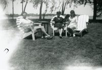 Black and white photo of three people seated out doors on a lawn. All are seated in Muskoka style chairs. In the