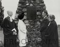 Photo of four people in 1960 facing the cairn and memorial plaque erected in the Ben Peacock had a cairn built in the St, IHS2480
