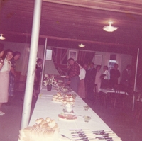 Shows a reception with a table prepped for potluck meal featuring Alice Baker, Molly de Montfort, Shirley Riley, Hazel