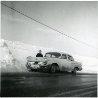 Photo taken on 19 February 1960 of Alice Baker against a snowy landscape standing beside a vintage car