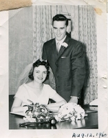 Black and white wedding photo of Wayne and Barb Martin taken on 12 August 1960. Barb is wearing a white dress and veil