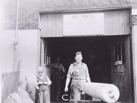 Photo of Mel Martin, local blacksmith, in front of his business in 1960. Standing on the left is Bruce Martin, with, IHS3382-109A