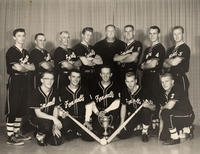 Team photo of the Fennells Softball Club, the South Simcoe Champions in 1963. The men are all wearing their uniforms,,