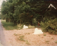 Driveway is flanked by two stone lion statues, leading to the Murray Family cottage on Lakelands Avenue in the Cedar