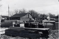 Photo of Hector Smith's lumber yard in Cookstown in the mid-1970s showing a large amount of lumber, both round and,