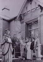 Stroud Women's Institute members dressed in Centennial costumes, in front of Stroud School, IHS3385-1