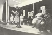 Black and white image of a stage during the 80th Anniversary of Cookstown Women's Institute. Five women can be seen sat