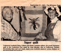 A newspaper clipping of two women standing in front of a quilt with the caption: "Super quilt: Cookstown residents Betty